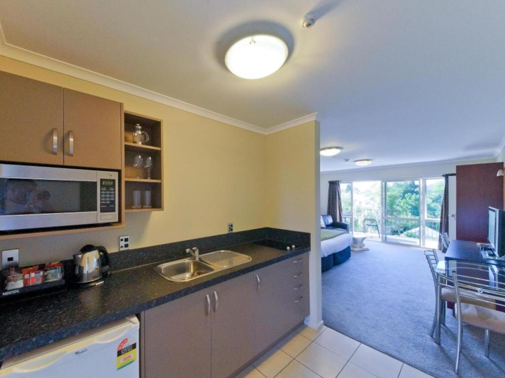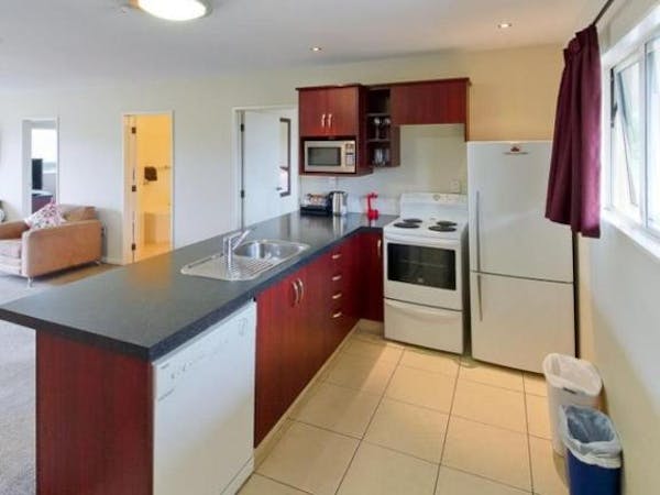 The apartment has a kitchen including microwave, dishwasher, cooktop, electric frypan and fridge/freezer.