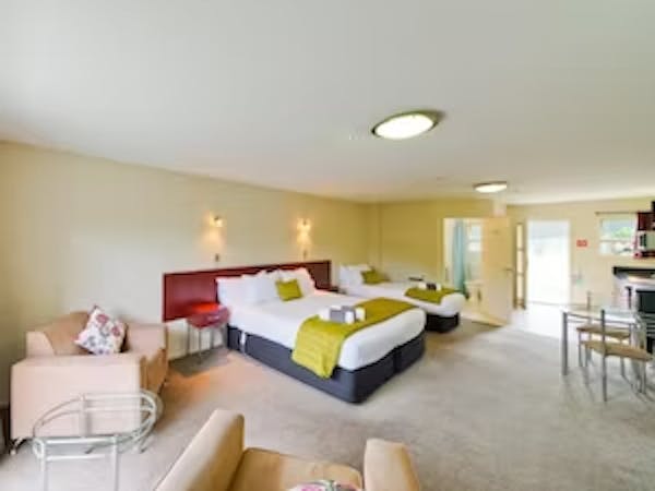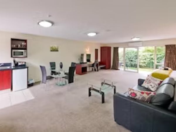 Spacious living area with 42” LCD TV with Netflix and smart TV in bedroom plus a workstation area. The kitchenette includes a cooktop, microwave and fridge.