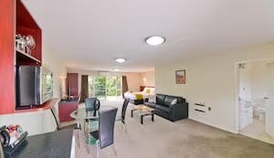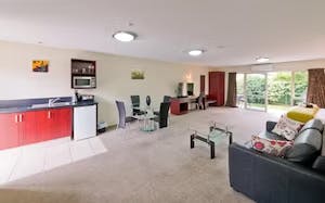 Large living area with 42” LCD TV with Netflix, large workstation area. The kitchenette includes cooktop, microwave and fridge.